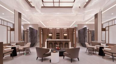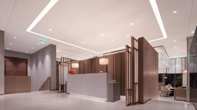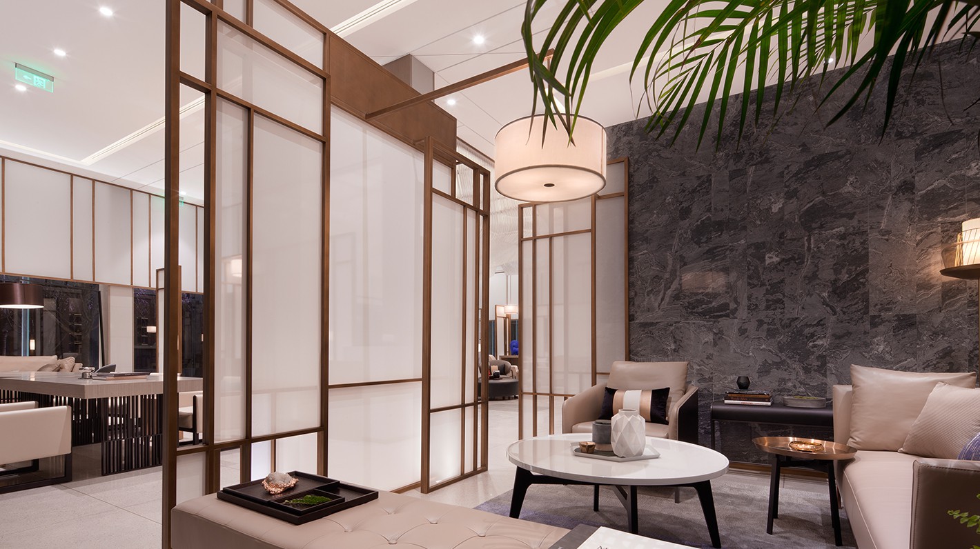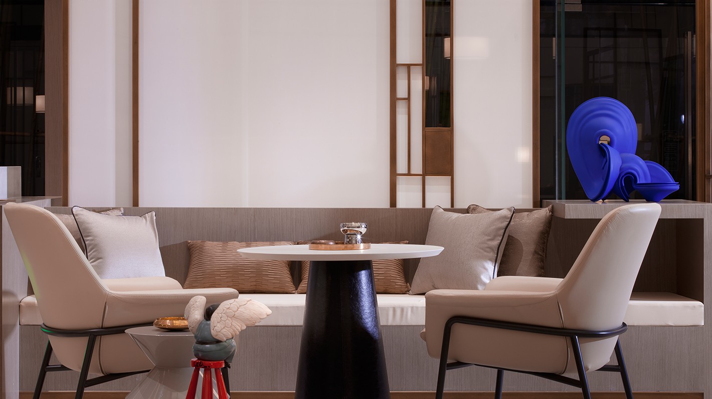 重灰色的石材、被建构的绢布与悬挑的灯,形成半高围合,拉近人与空间的尺度。 在家具的运用上,剥离文化属性,注重人的感受和洽谈的功用。