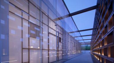 引导、往前、站定。水面、灯光、墙体形成了灰空间的半围合,清虚的玻璃盒子陷在厚重的“美景灰”中,朦胧半透,游离漂浮。