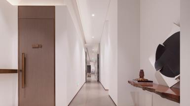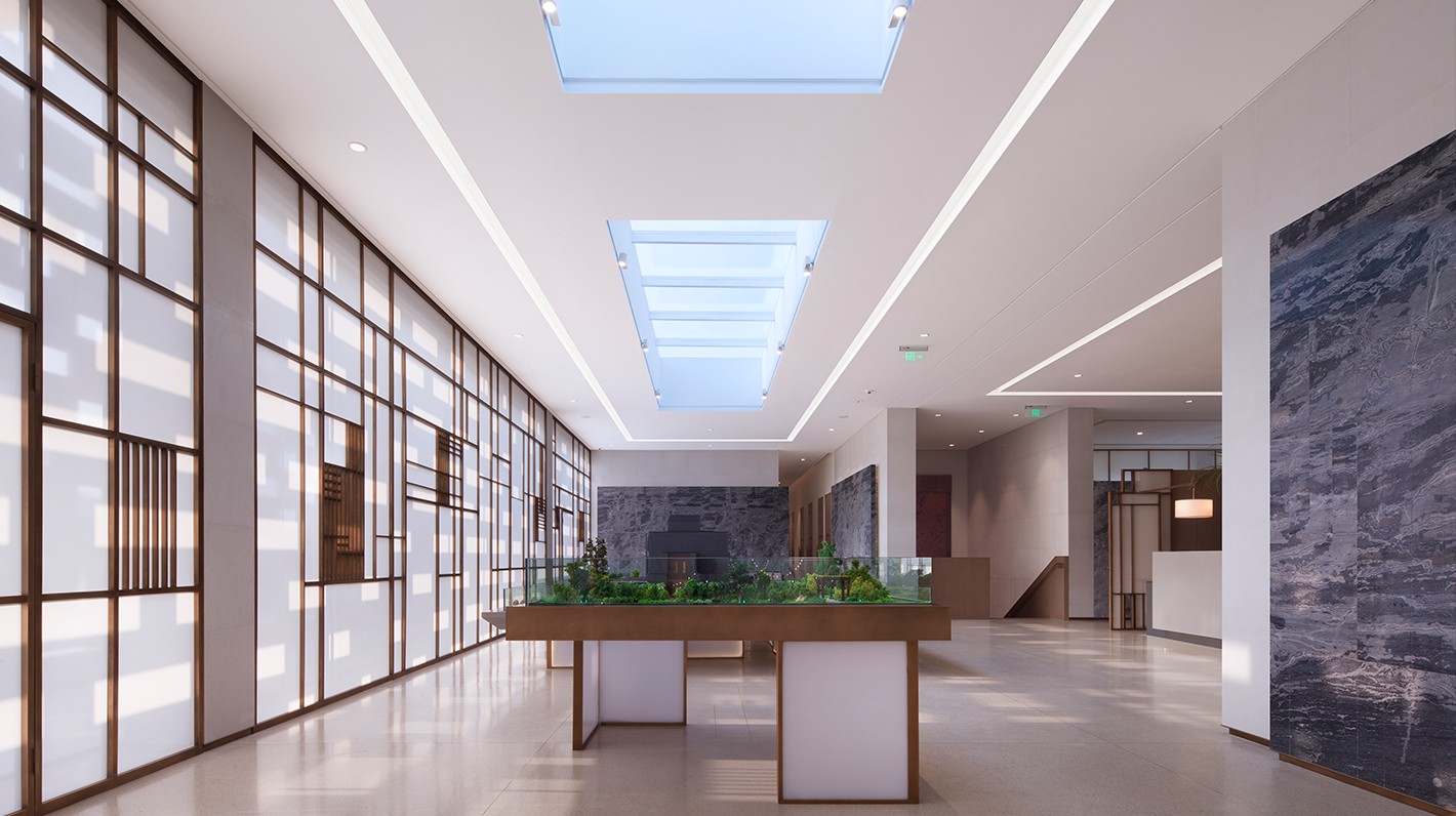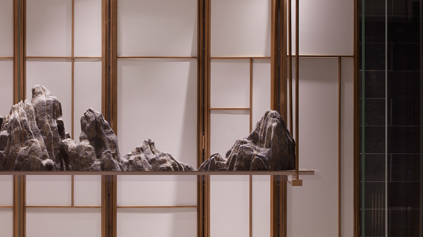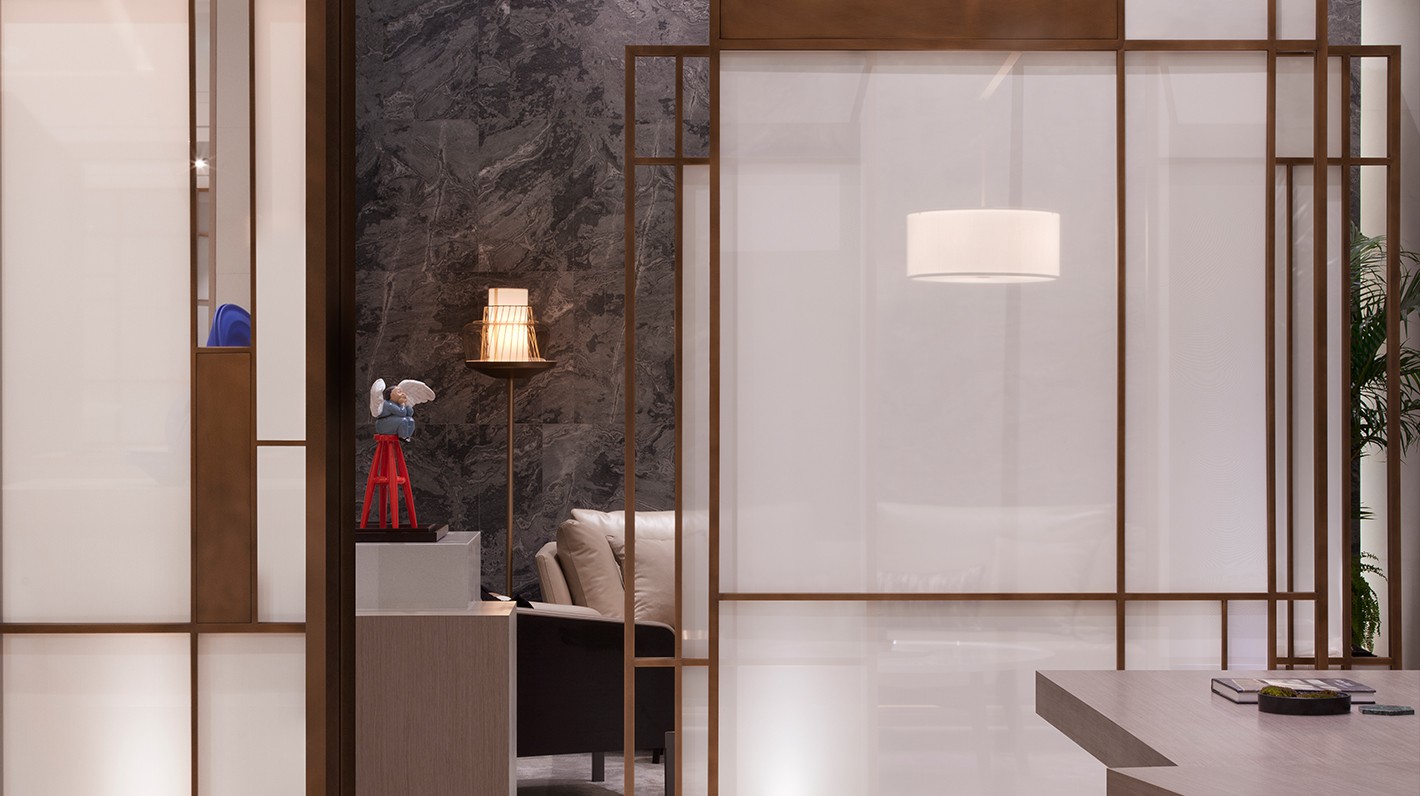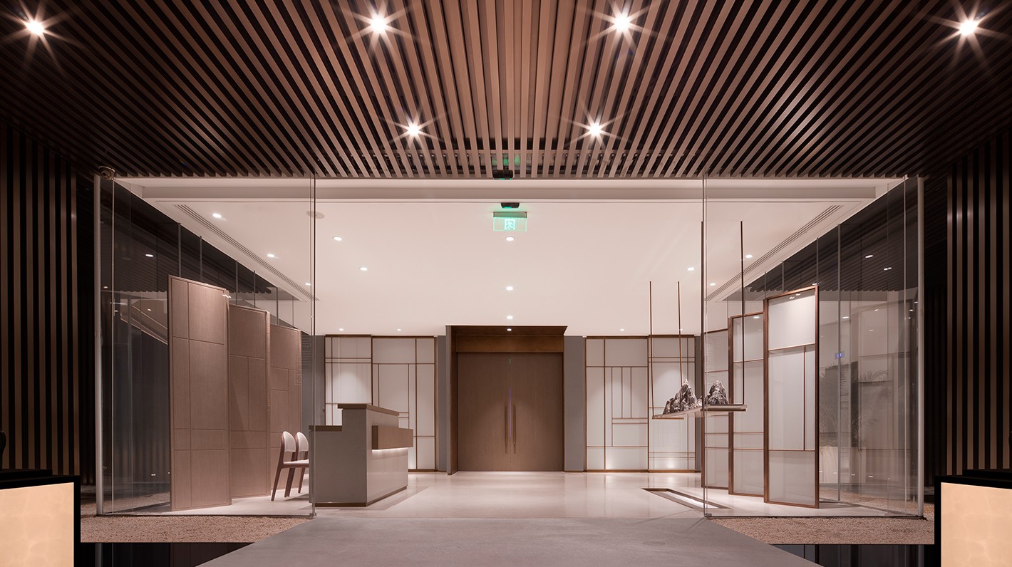 进入接待空间,空间弥漫着“暧昧”、“静谧”、“朦胧”。眼光探索空间、灯光、透明度以及各种材料的本质。弱化实体的天花和地面,在透明立面的处理上,运用线面之间的重叠、交织、并置,将视觉的平面构成延伸到立体的空间中,在立面上创造出一种微妙的“轻”。做旧的铜有机建构具有文化属性的绢、灰的秋香木、质朴的水磨石,平衡内部虚实,建立起空间的基本构筑关系,形成内在张力。艺术应运而生,“山”在此刻也变得轻盈。