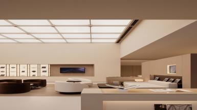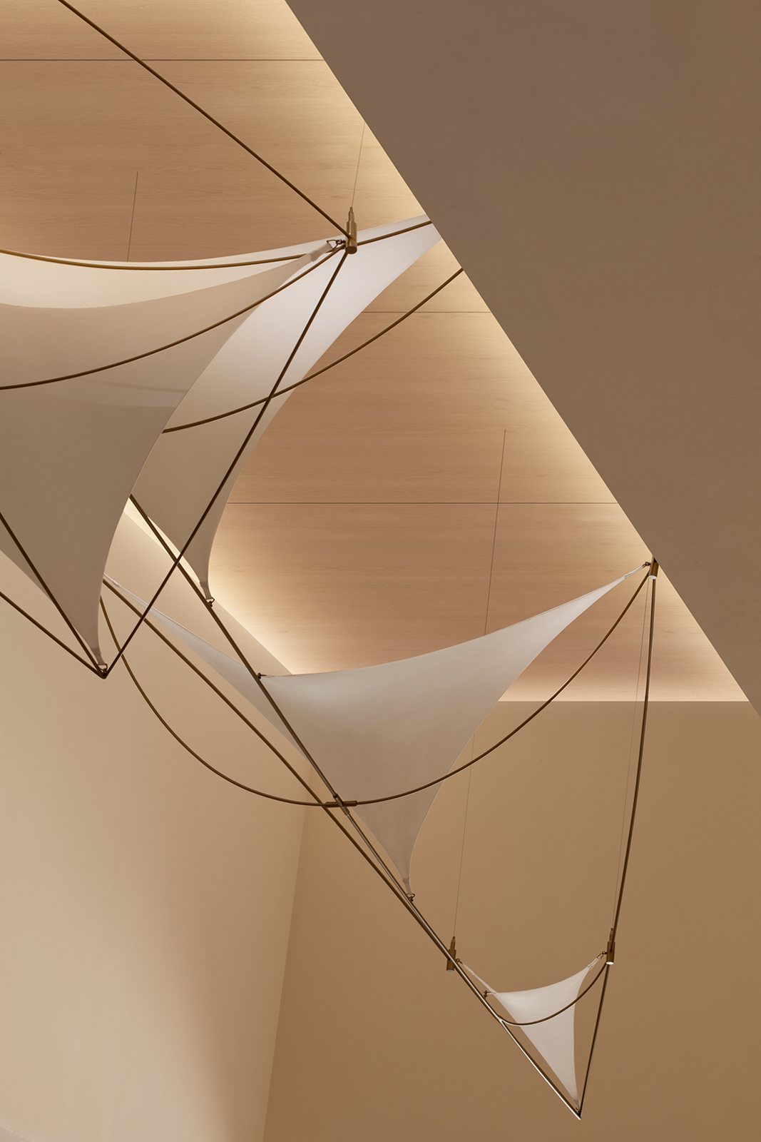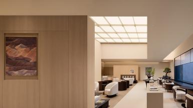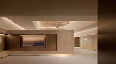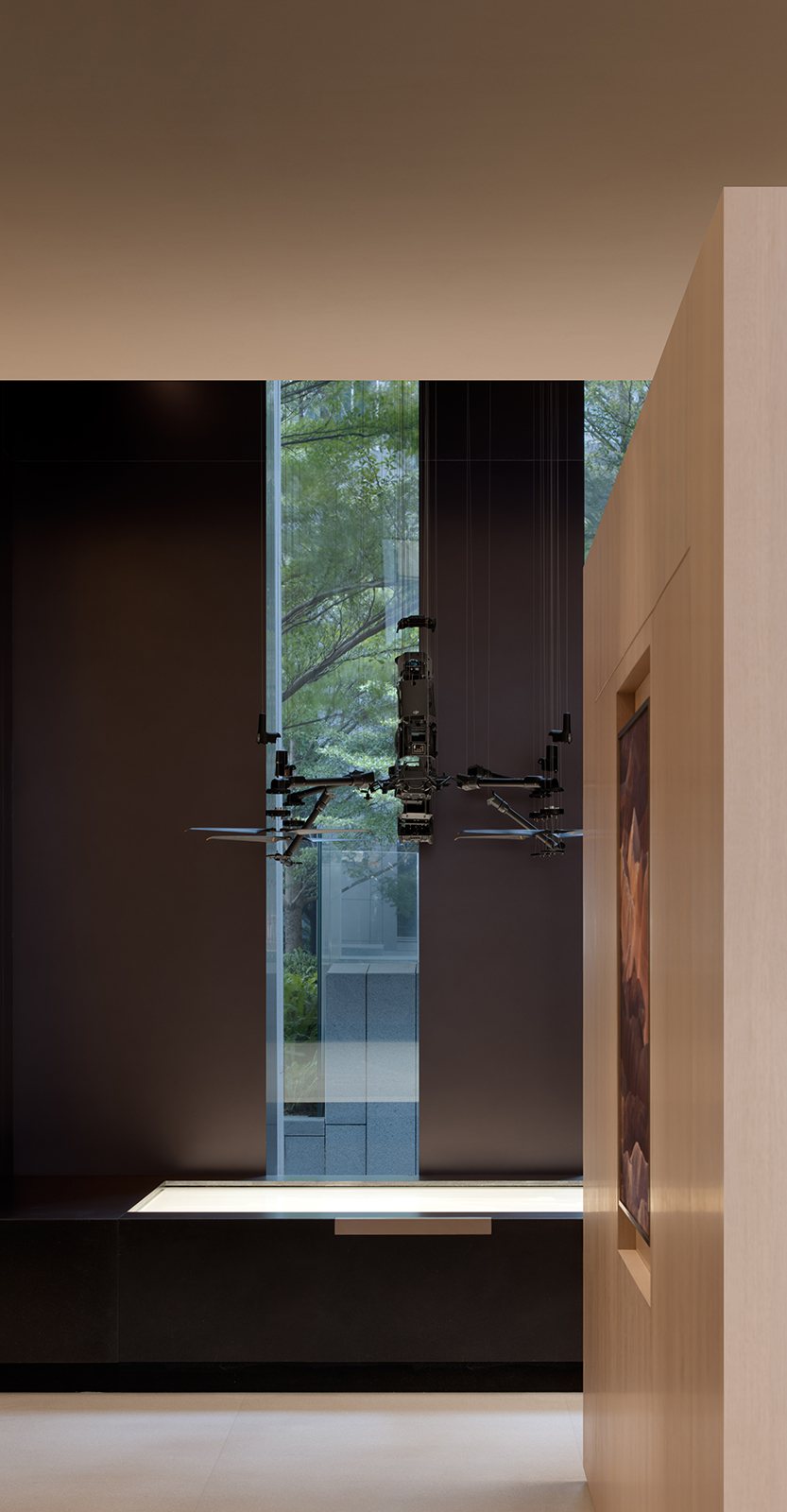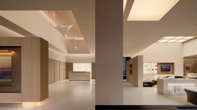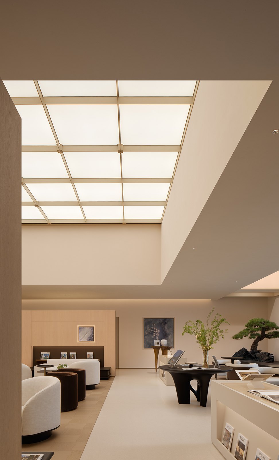 空间的节奏,蕴含着东方式的呼吸。在玻璃与钢铁的冷峻秩序间,悄然泊出一隅陶暖。入口的通道,是进入主厅前一次轻柔的屏息。随即,视野豁然开朗。目光所及,天花悬挂着从风筝意象中幻化而出的艺术装置,以极其轻盈的姿态悬浮,仿佛承载着人类对飞翔最原始的渴望与想象。这里,是空间的枢纽,也是思绪的转换之处——向左,通往沉浸式的产品世界;向右,步入可供休憩的心灵角落。