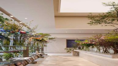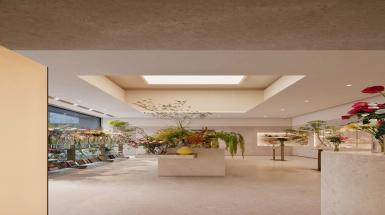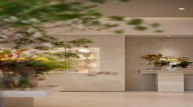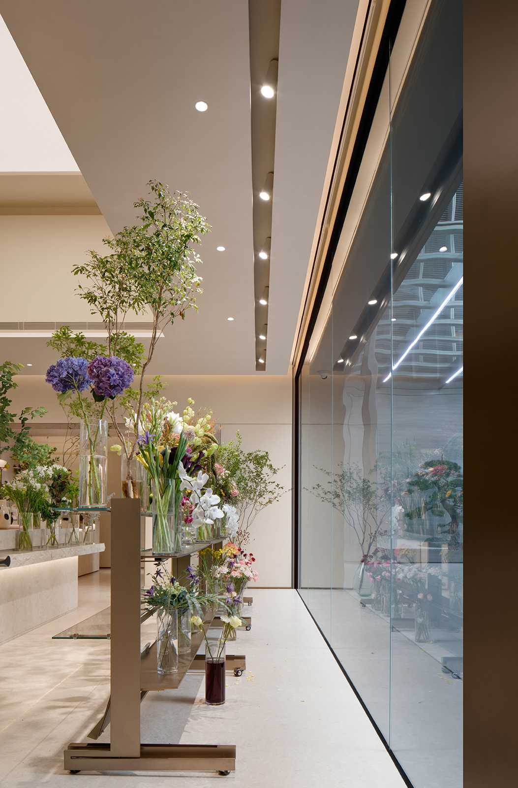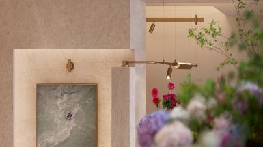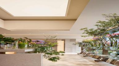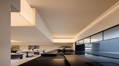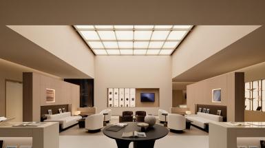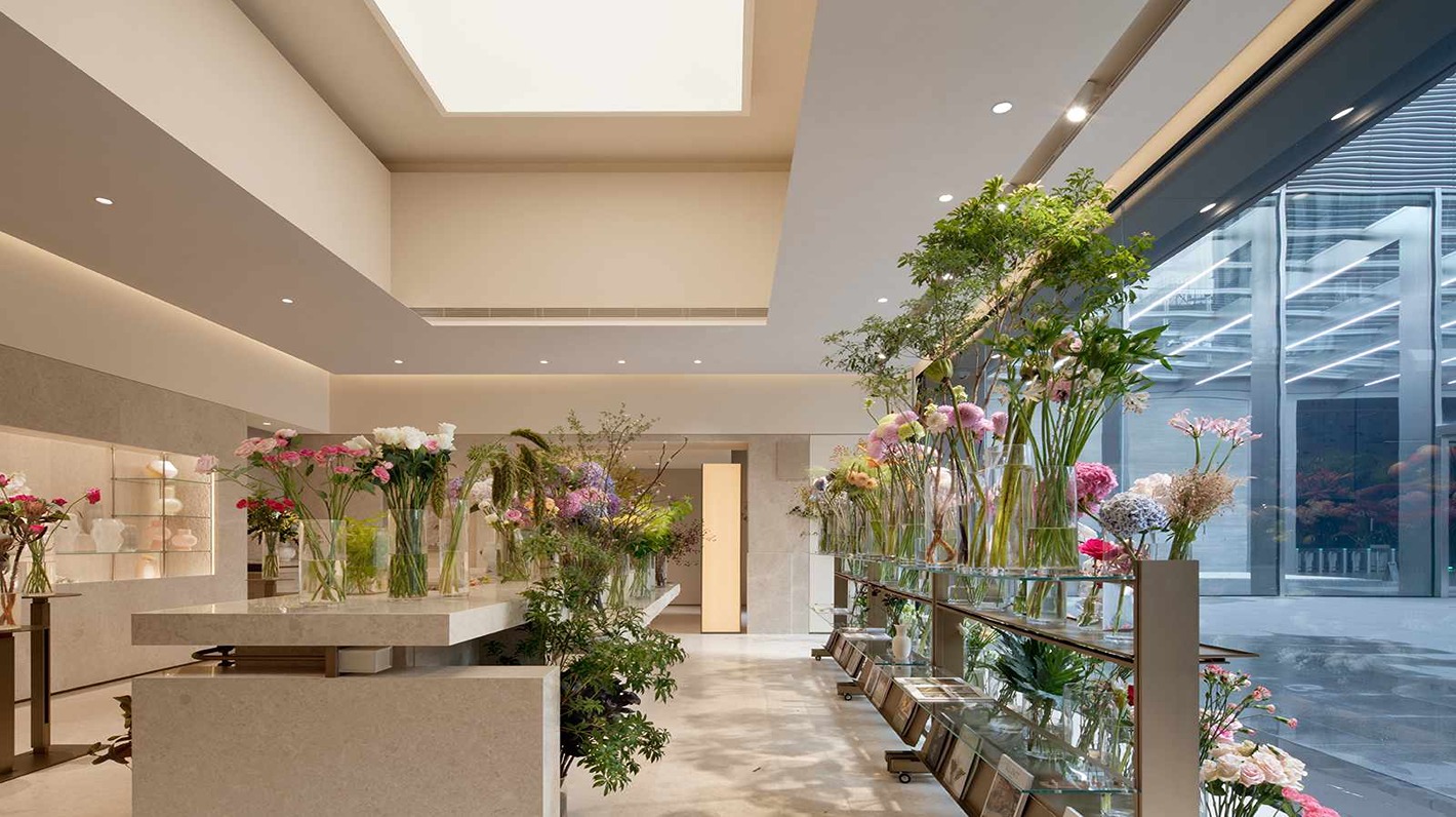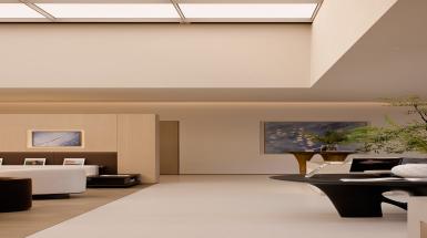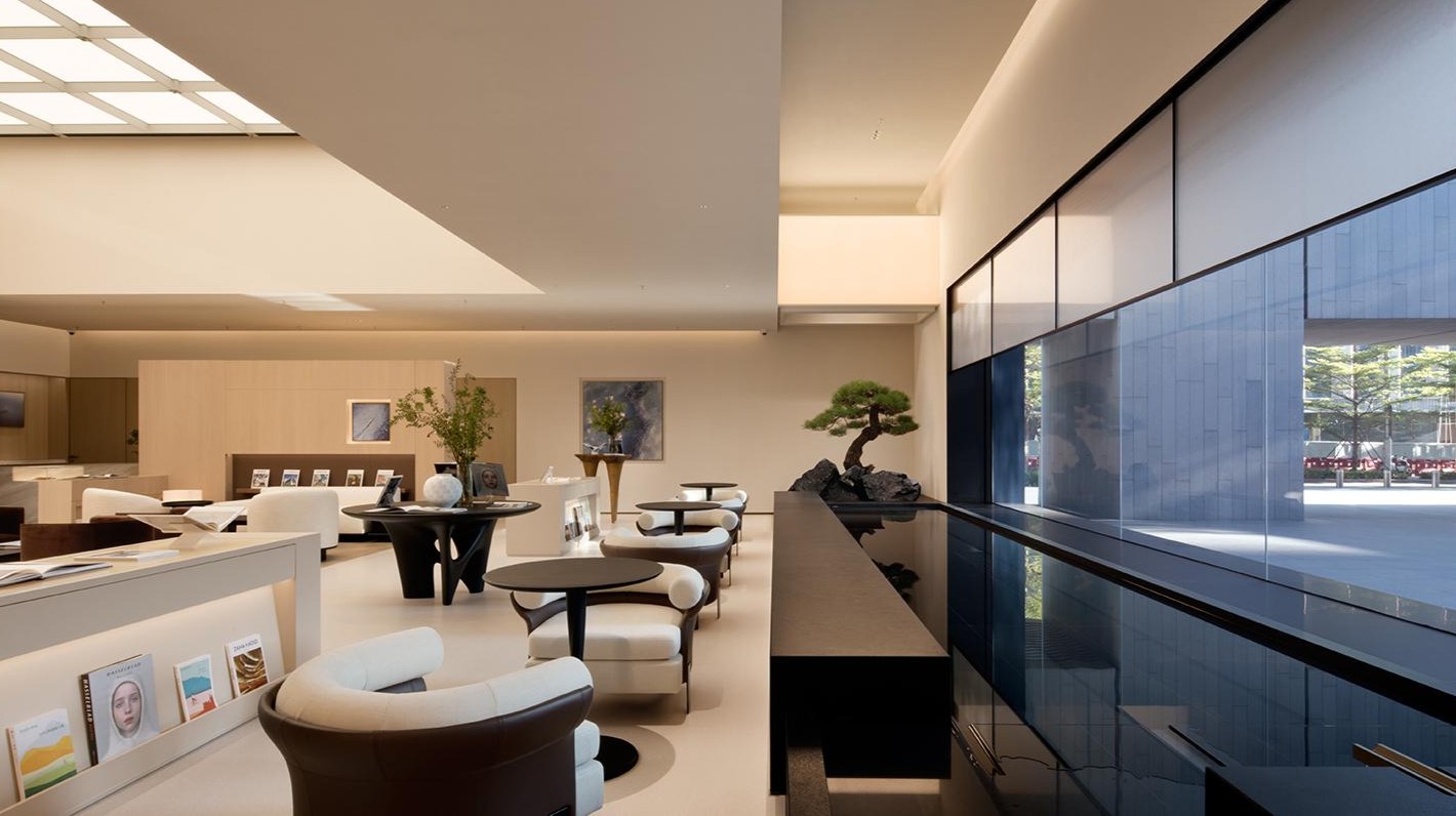 空间的节奏,蕴含着东方式的呼吸。在玻璃与钢铁的冷峻秩序间,悄然泊出一隅陶暖。入口的通道,是进入主厅前一次轻柔的屏息。随即,视野豁然开朗。目光所及,天花悬挂着从风筝意象中幻化而出的艺术装置,以极其轻盈的姿态悬浮,仿佛承载着人类对飞翔最原始的渴望与想象。这里,是空间的枢纽,也是思绪的转换之处——向左,通往沉浸式的产品世界;向右,步入可供休憩的心灵角落。
