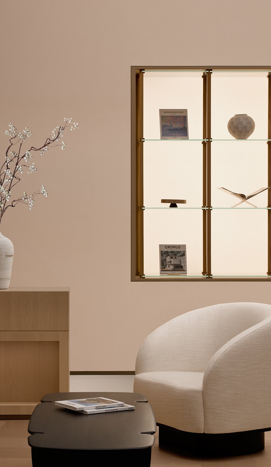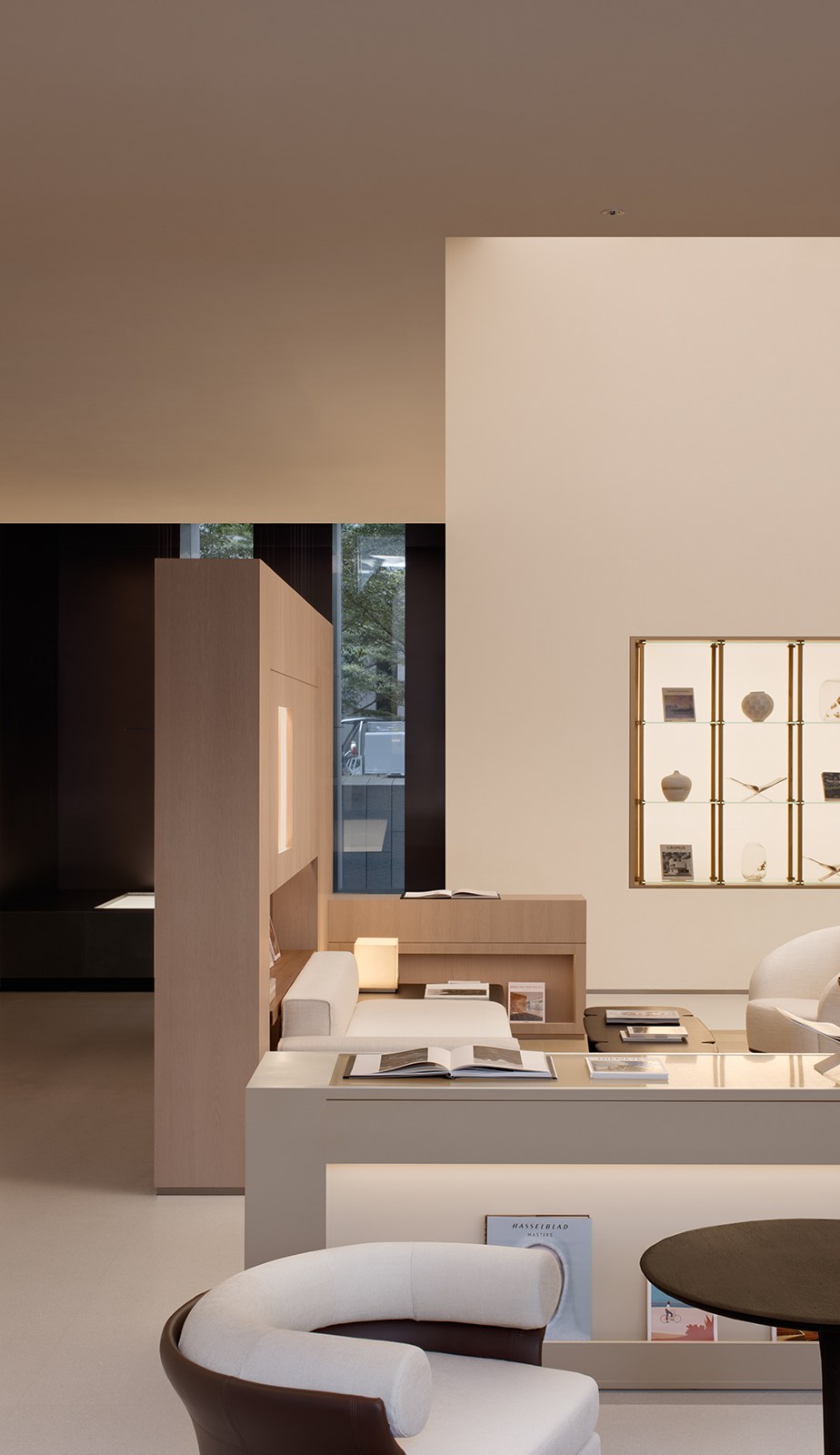 “大疆小铺”是一个被精心营造的科技艺廊。核心展台宛如静置的舞台,聚光灯下是革新行业的无人机系列。两侧墙面则如舒展的书页,系统地呈现产品及品牌周边。所有展柜的构思,源自东方榫卯的智慧与逻辑,并以现代的模块化语言重新诠释,使其成为能够伴随产品不断生长的有机系统。高挑的空间与均匀柔和的光线自上而下漫溢,营造专注而友好的氛围,让科技的深邃,变得直观而可亲。