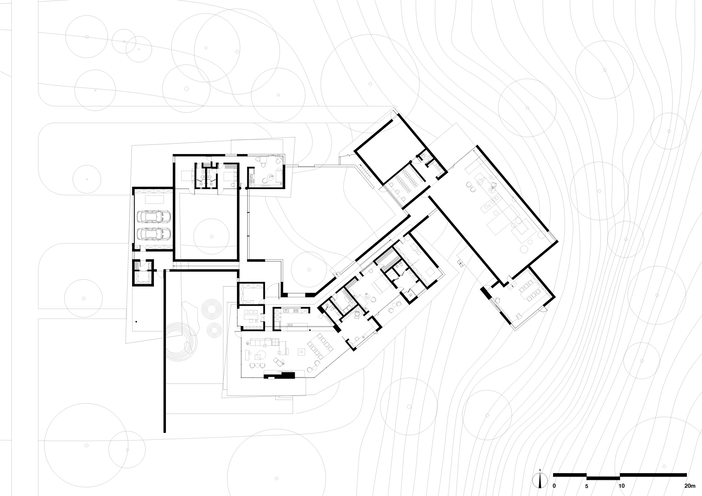 开窗的大小决定了光的进入方式。不同房间的亮度与明暗,也因此各不相同。屋顶被设计成曲折面,避开传统对称,也解决了冬季大雪的排雪需求。百年老树旁特意留出了一片平屋顶,可以在晴朗夜晚仰望月色与星辰。